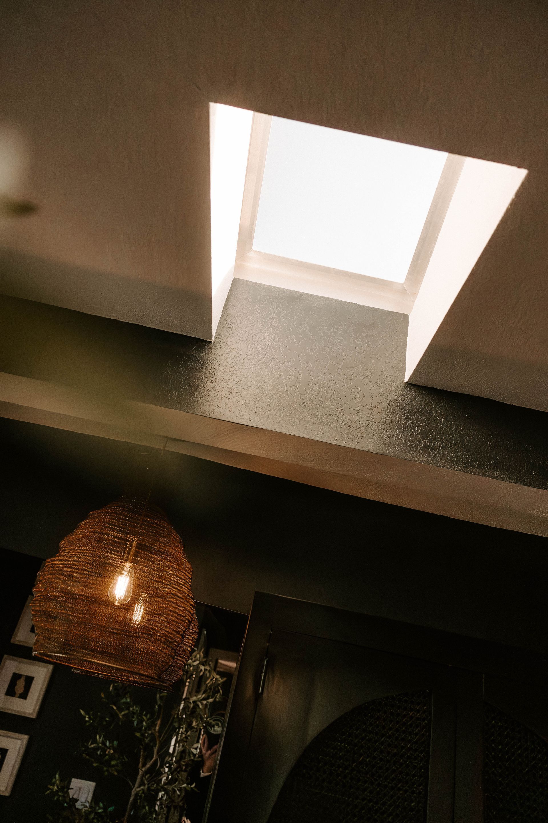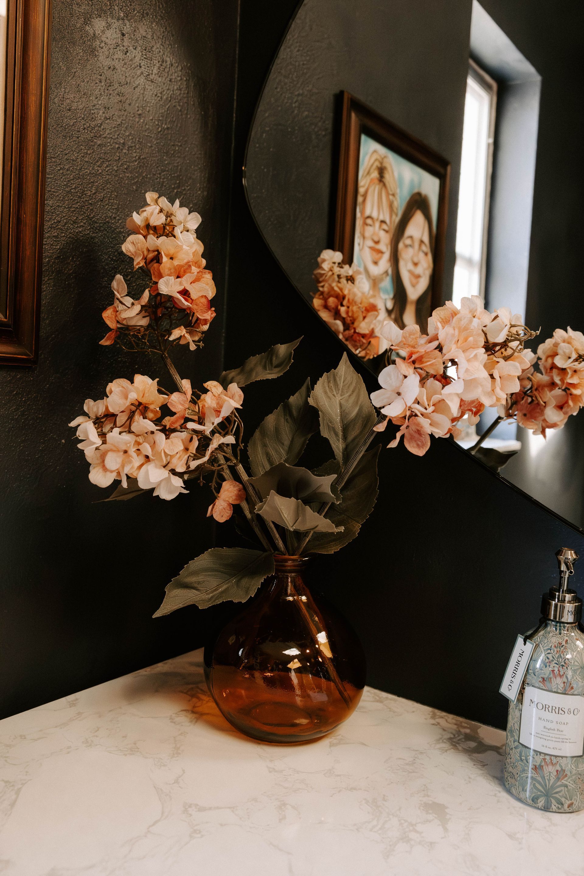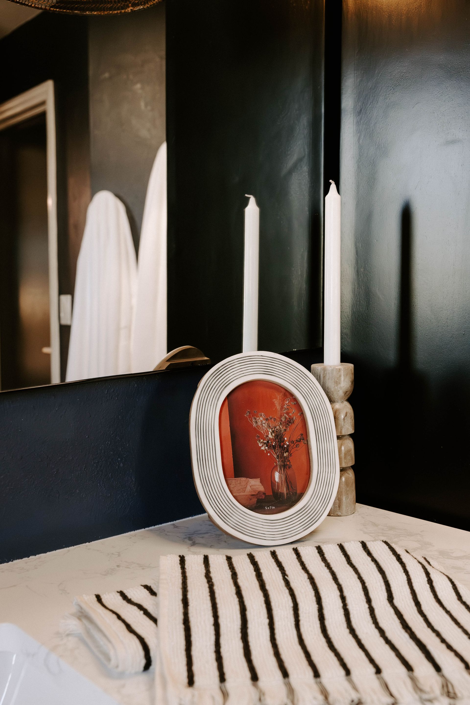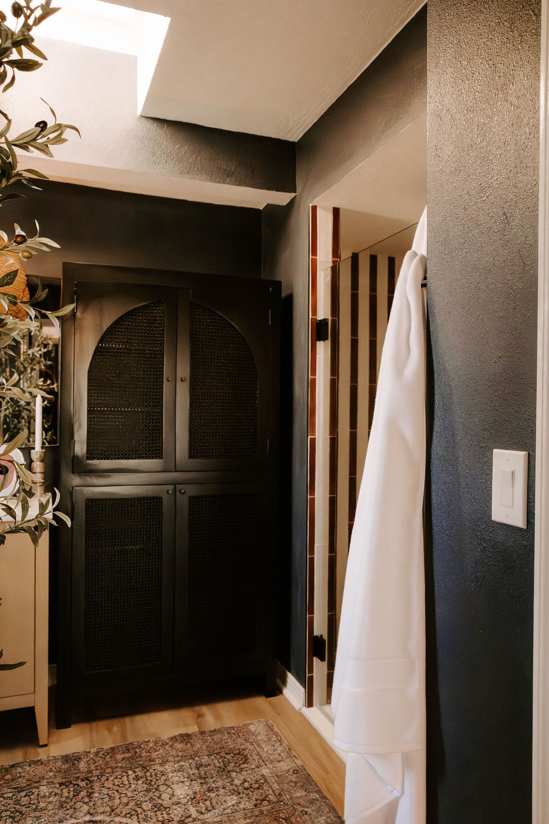 The second bathroom embraces a richer, moodier vibe. From the striped shower to faux limestone–painted walls, every element was curated to feel grounded and soulful. A black mango-wood vanity sits alongside a full sink cabinet, balancing darkness with natural lightness and enhancing the organic flow of the space. Nature is brought indoors not only through materials, but also through a meaningful personal touch—an element inspired by one of the client’s favorite memories shared with her daughter.